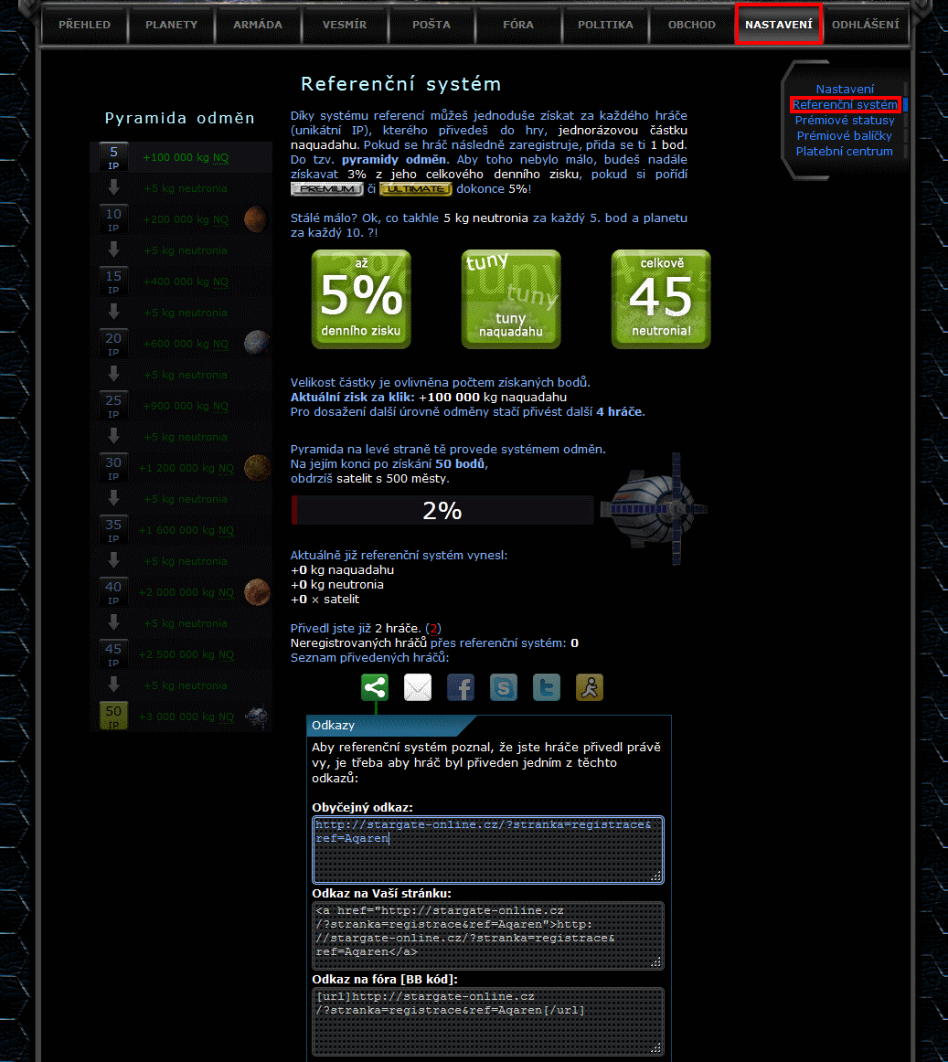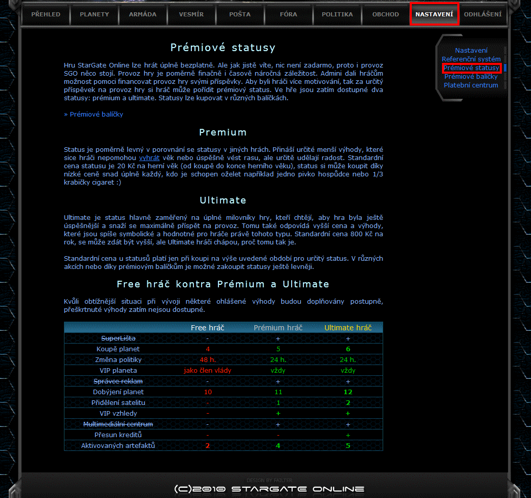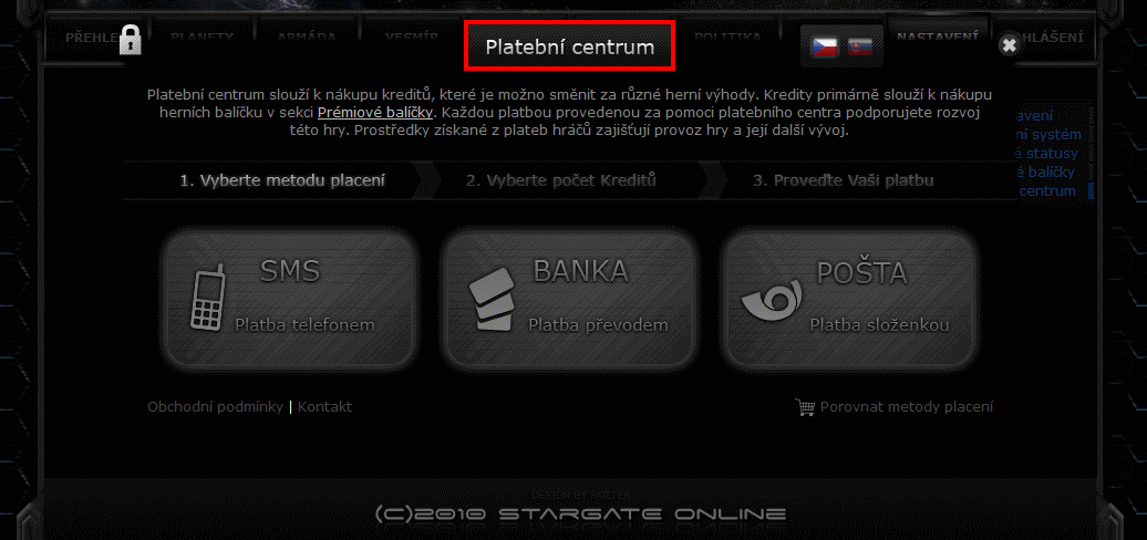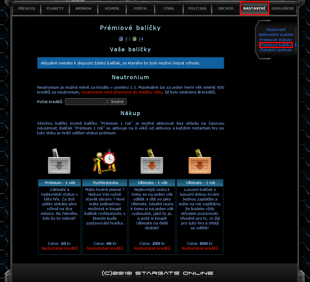 V této záložce je možnost koupit si prémiové balíčky a také se zde aktivují. Po aktivaci balíčku jsou hráči ihned aktivovány jeho výhody a přidělena planeta, kterou si hráč musí v "planetách k osídlení" vyzvednout.