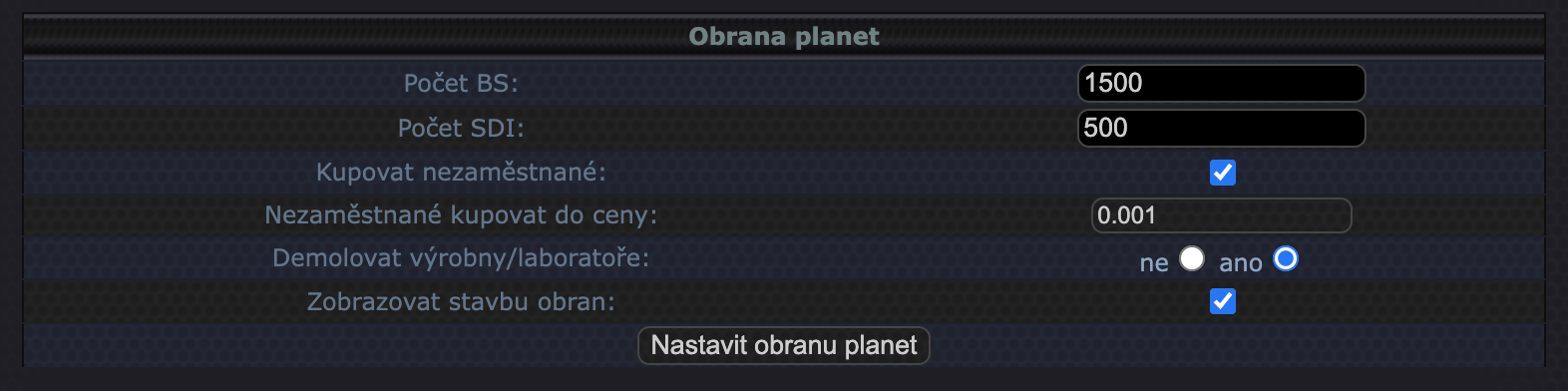 Takto lze vyplnit stavbu obran - bude vám stavět 1 500 BS a 500 SDI s tím že bude-li planeta plná tak bude bourat výrobny/laboratoře. A nebudete-li mít zaměstnané tak se nakoupí. Tato cesta je z mého pohledu vhodná zejména pro rychlé doplnění obranných budov v případě že vám někdo sestřelí obranu planety - ale klikat celé impérium bych pomocí tohoto nedělal.