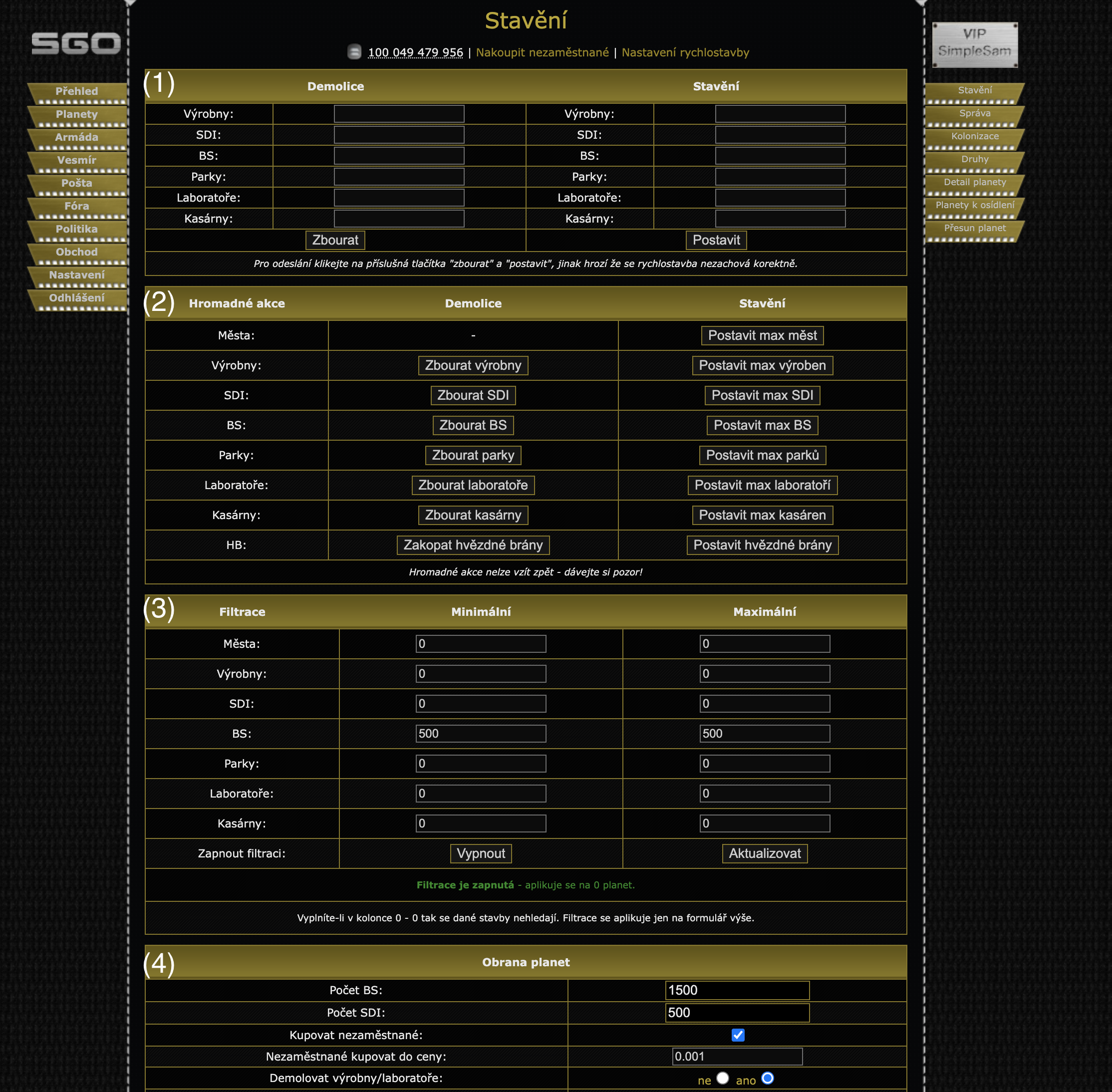 [Novinka 2/2022] - nově je možnost si nastavit ve formuláři (3) jaké vlastnosti by měly mít planety kde chcete stavět. Můžete si navolit třeba planety mezi 100 a 200 městy a následně pomocí formuláře (1) můžete zbořit konkrétní počet výroben (například 5 000) a postavit na těchto planetách přesné pošty BS a SDI tak jak potřebujete.