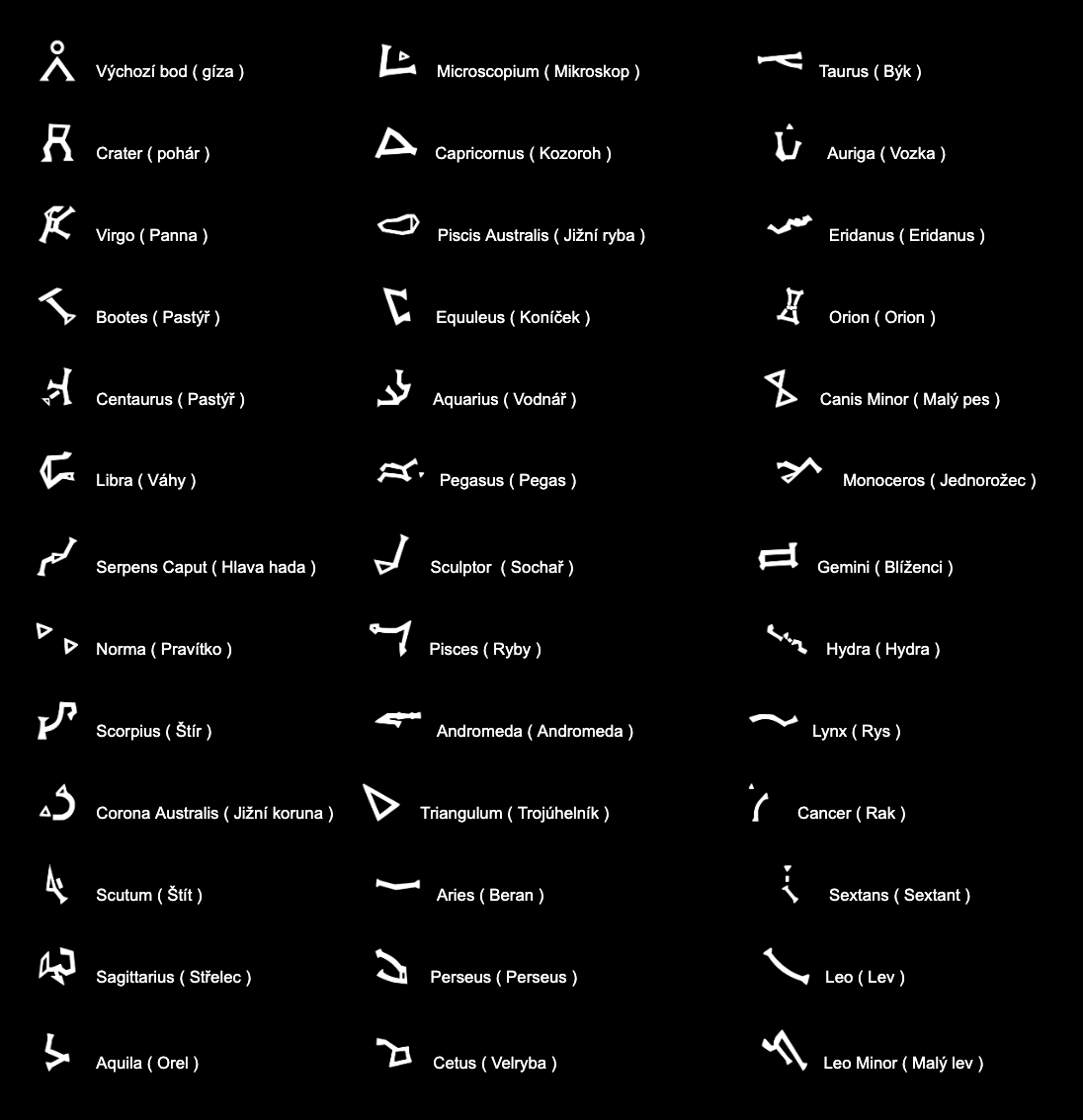 39 znaků - 6 jich slouží k určení cílové adresy a sedmý se zadává jakožto výchozí bod. Názvy jsou latinsky a jsou velmi podobné tomu jakým jazykem mluvili. Antikové v závorce naleznete povětšině české názvy souhvězdí.